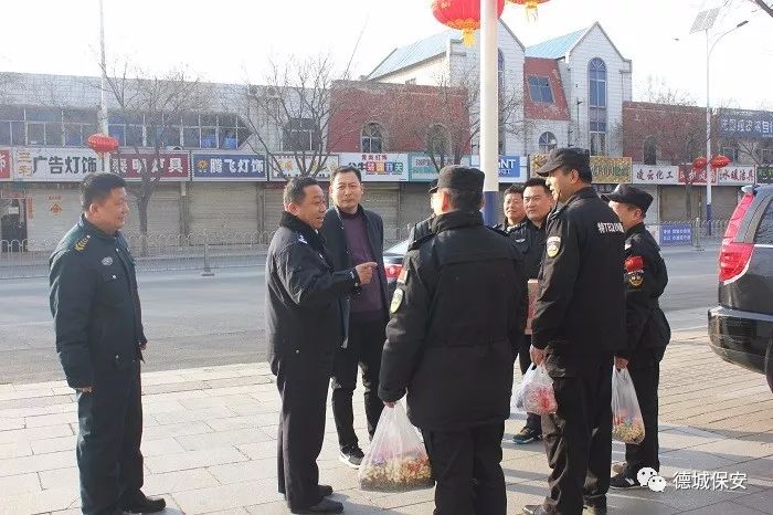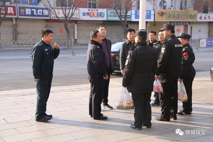 爆竹聲聲喜報前程似錦,梅花朵朵歡呼萬象更新。2.15號,臘月三十,德城公安分局黨委成員、副局長井站文攜恒威安保服務(wù)有限公司領(lǐng)導(dǎo)班子成員分赴安保一線進(jìn)行督導(dǎo)、慰問,向春節(jié)期間堅守在安保一線的同志們送去節(jié)日的問候和祝福。